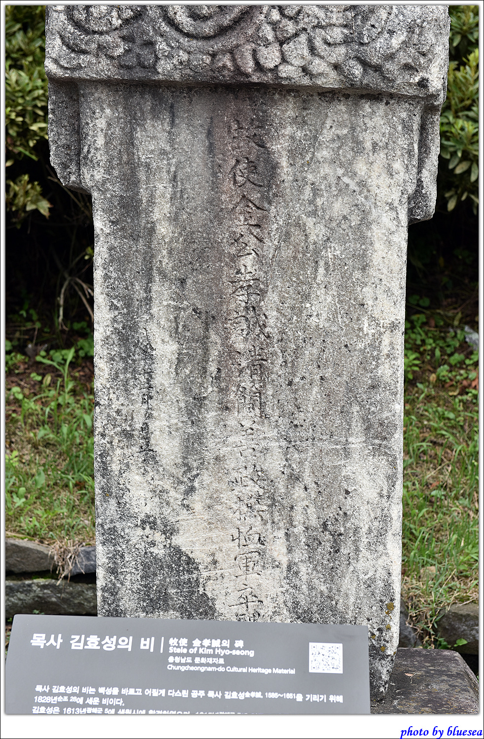 공주 공산성 입구에 있는 선정비중에 하나인 목사 김효성의 선정비입니다. 목사김공효성청간선정무휼군졸비(牧使金公孝誠淸簡善政撫恤軍卒碑 )라는 기인 이름이 각자되어 있습니다 비수와 비신이 일체형이며 조금은 투박하지만 비수의 문양이 아름답습니다. .