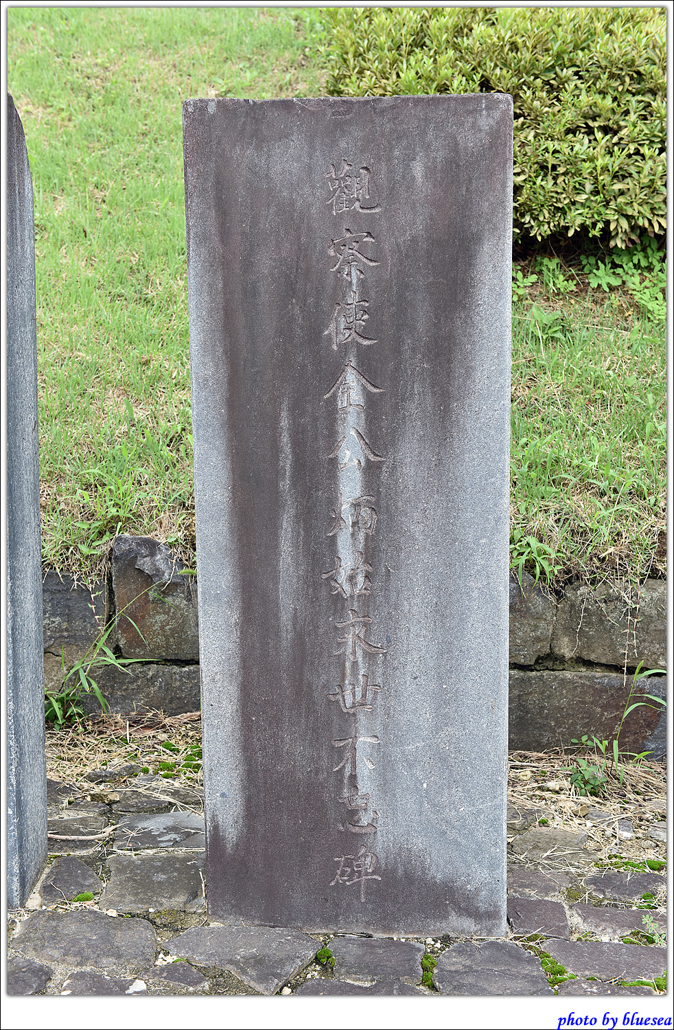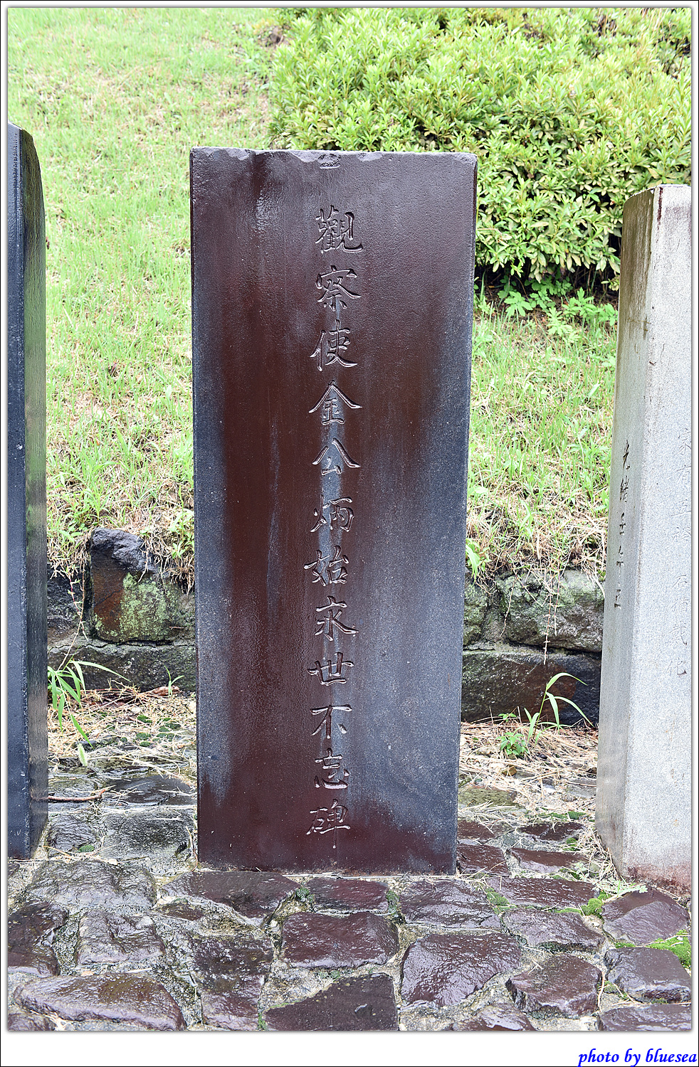 공주 공산성 입구에 자리한 선정비중에 하나인 관찰사 김병시의 영세불망비입니다. 비석의 전면에는 관찰사김공병시영세불망비(觀察使金公炳始永世不妄碑)라고 각자되어 있습니다.비의 개석은 훼손된듯 합니다. 비석의 건립시기는 김병시가 공충도관찰사의 임무를 마치고 이임한후인 을해년7월(1875년)이다. 김병시는 1870년 공충도 관찰사로 부임하였다."고종실록"에 의하면 김병시는 관찰사 부임이 후 목화가 흉작이란 사실을 보고하고 또한 환곡문제의 해결방안을 건의 하고 조령의 적도를 탐문했던 활동상이 보이며 정사를 잘 베풀어 백성들이 그의 연임을 바라니 임기를 1년 늘린 기록이 보인다.[공주시지]