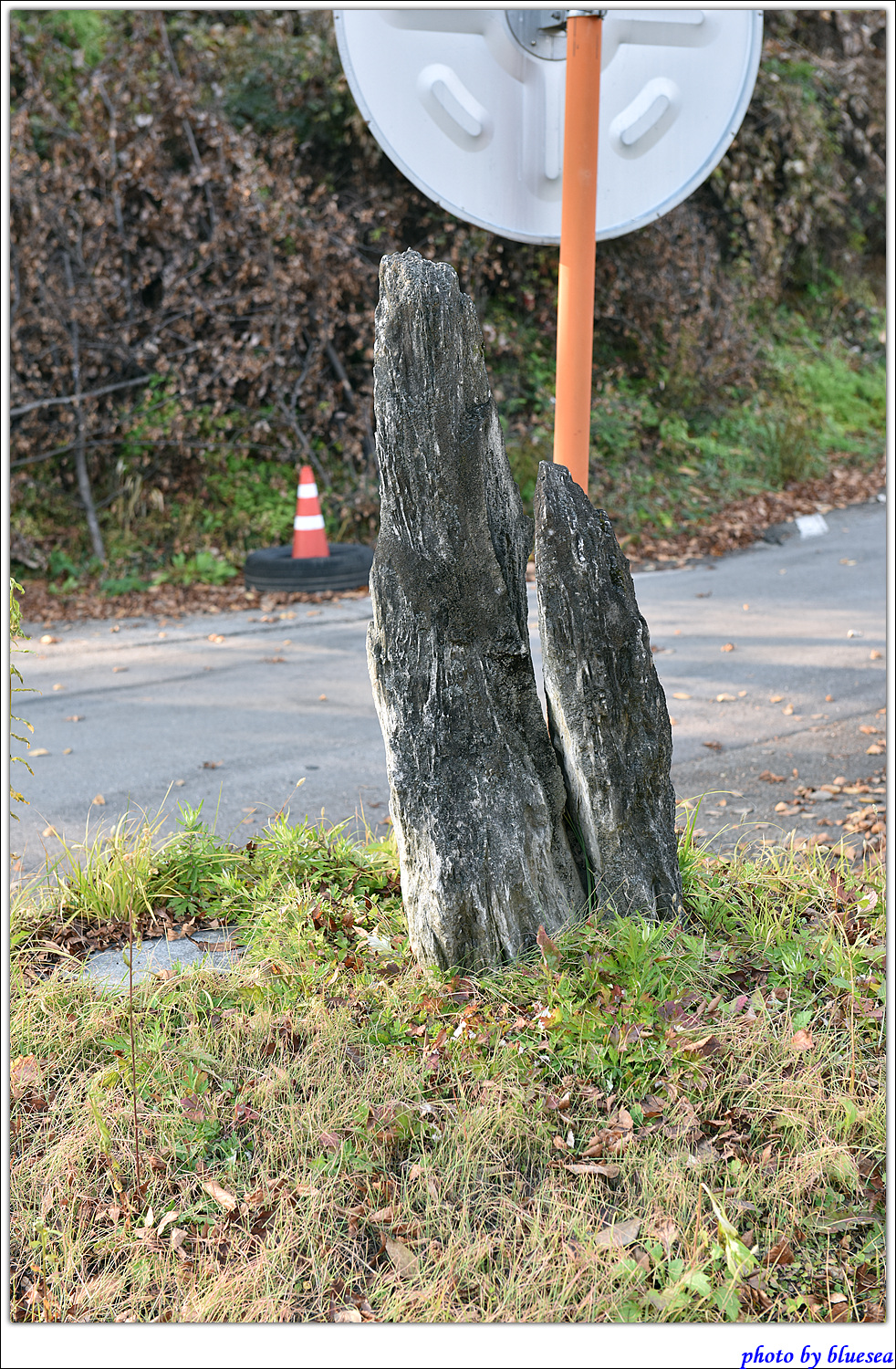 터골 마을 입구 길가에 서있다. 사각주형에 가까운 자연석으로 상단부는 뾰족하다 높이 90Cm, 너비 45Cm, 두께 33Cm이고 여러개의 금줄이 쳐져있다. 마을 사람들이 ‘지신(地神)’ 이라 부르고 있으며 선돌과 돌탑을 합하여 ‘동구지신(洞口之神)’ 이라 부르고 동제를 지내고 있다