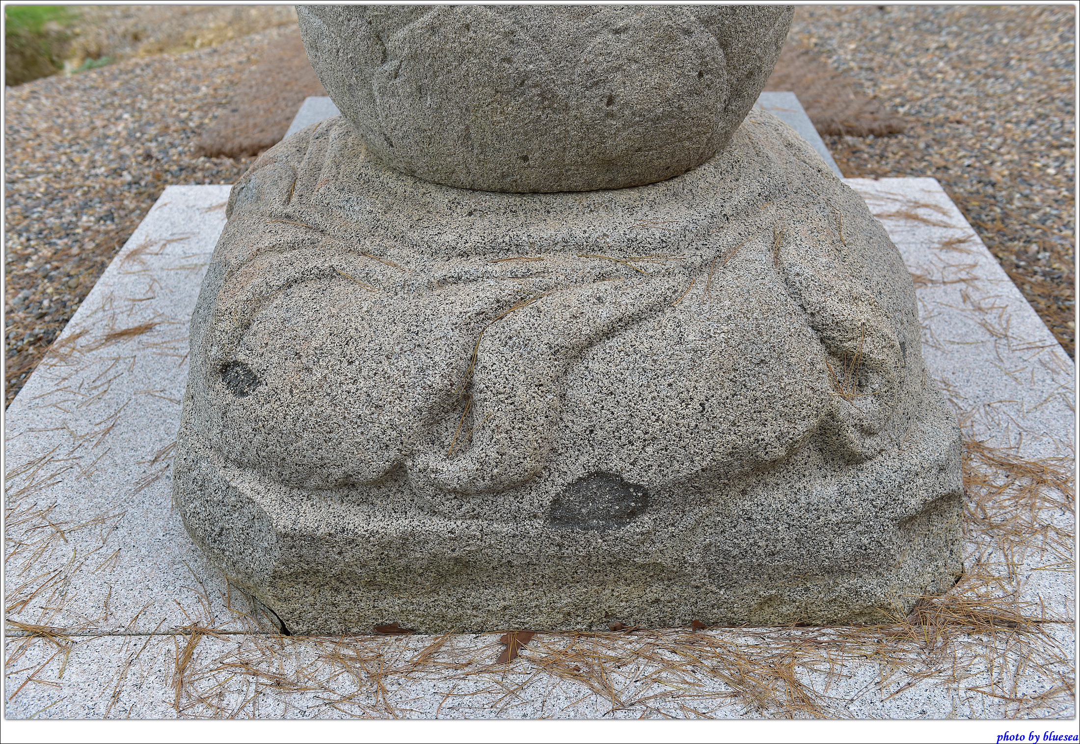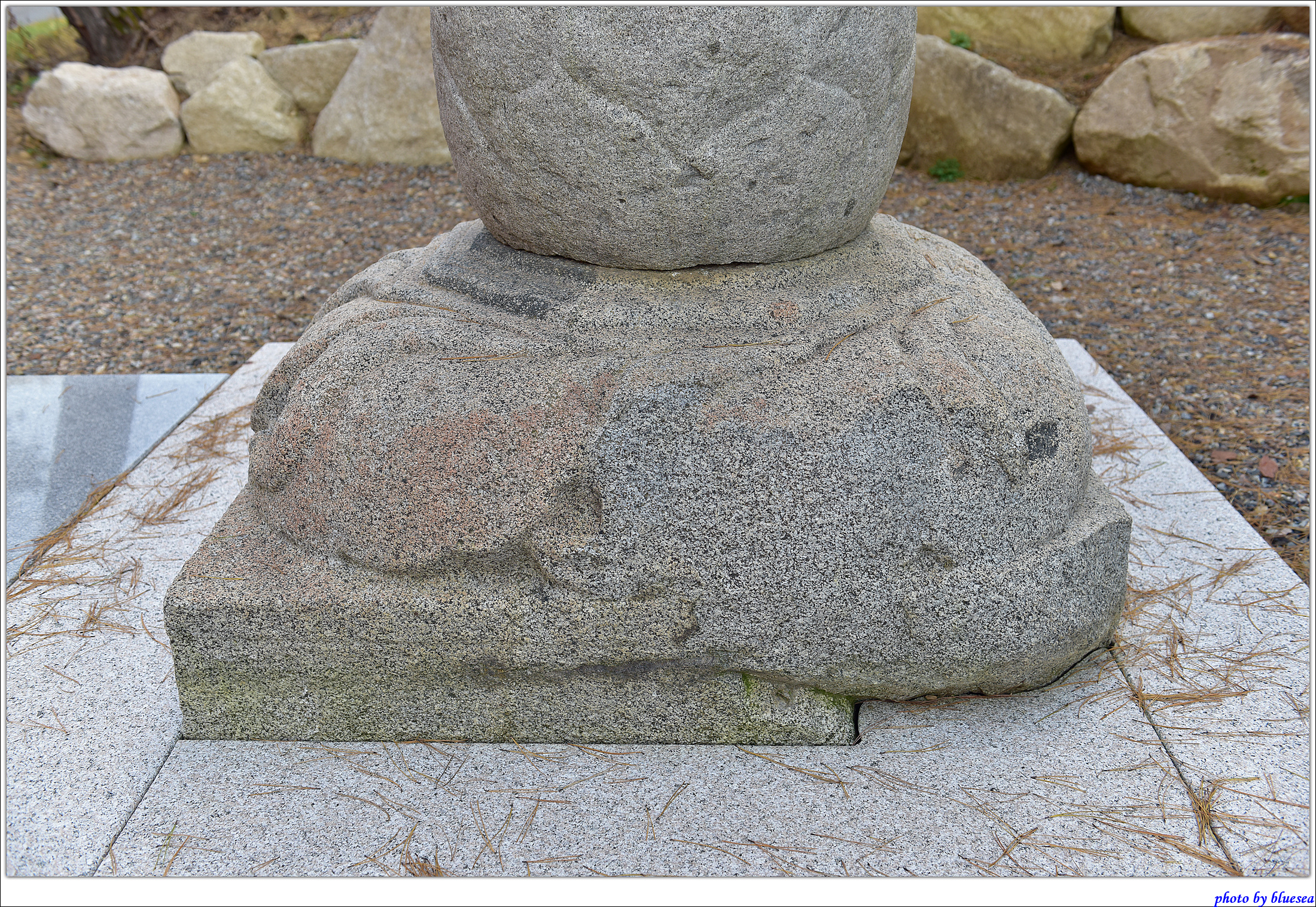 기단석은 상·하 2단이 1석으로 되어있다. 하단 기단 석은 너비 124㎝, 높이 17㎝로 각 면에는 3구씩의 안상이 조각되어 있고, 그 위에는 상단 기단석이 있다. 상단 기단 석은 너비 102㎝, 높이 38㎝로 복련이 조각되어 있고, 상 면에는 각호각형 3단의 탑신괴임이 치석되어 있다. 복련 석은 연꽃잎 끝을 시계방향으로 살짝 올려서 표현하였다.