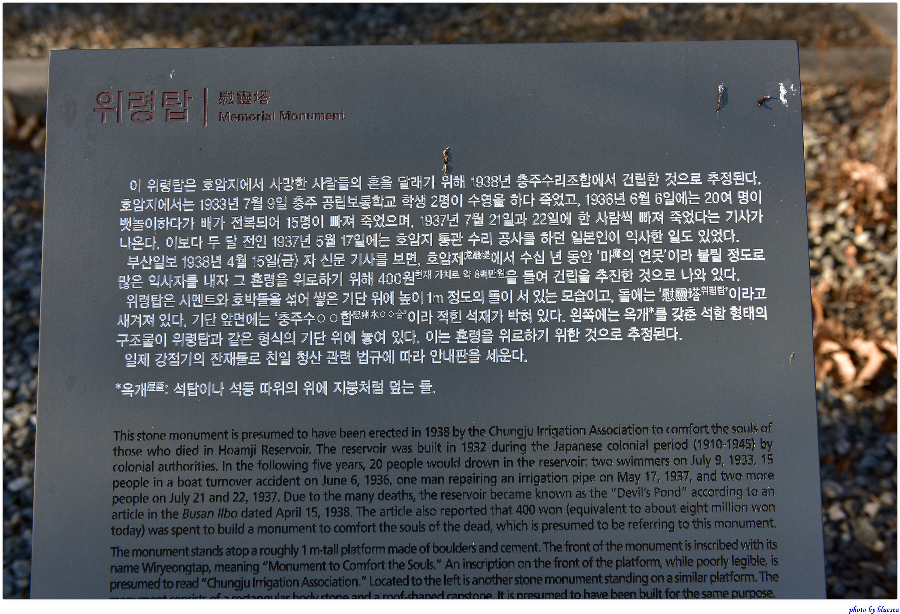 - 역사적 맥락: 이 비석은 일제가 한국을 자국 식량 공급지로 만들기 위해 저수지와 수리조합을 강제로 설립·운영한 산미증식계획의 일환으로, 당시 달천평야의 토지 절반을 일본인이 소유하고 있었고, 한국인 농민들은 토지를 잃거나 소작농으로 전락하는 등 경제적 어려움을 겪었습니다.